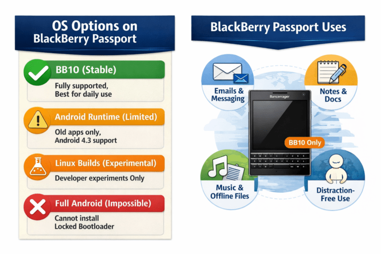As of 2026, the BlackBerry Passport can only run BB10 properly. You can use Android Runtime for very old apps, experiment with non-functional Linux builds, but cannot install real Android. If you understand these limitations, the Passport still works well as a secondary device, writing tool, or collector’s item.